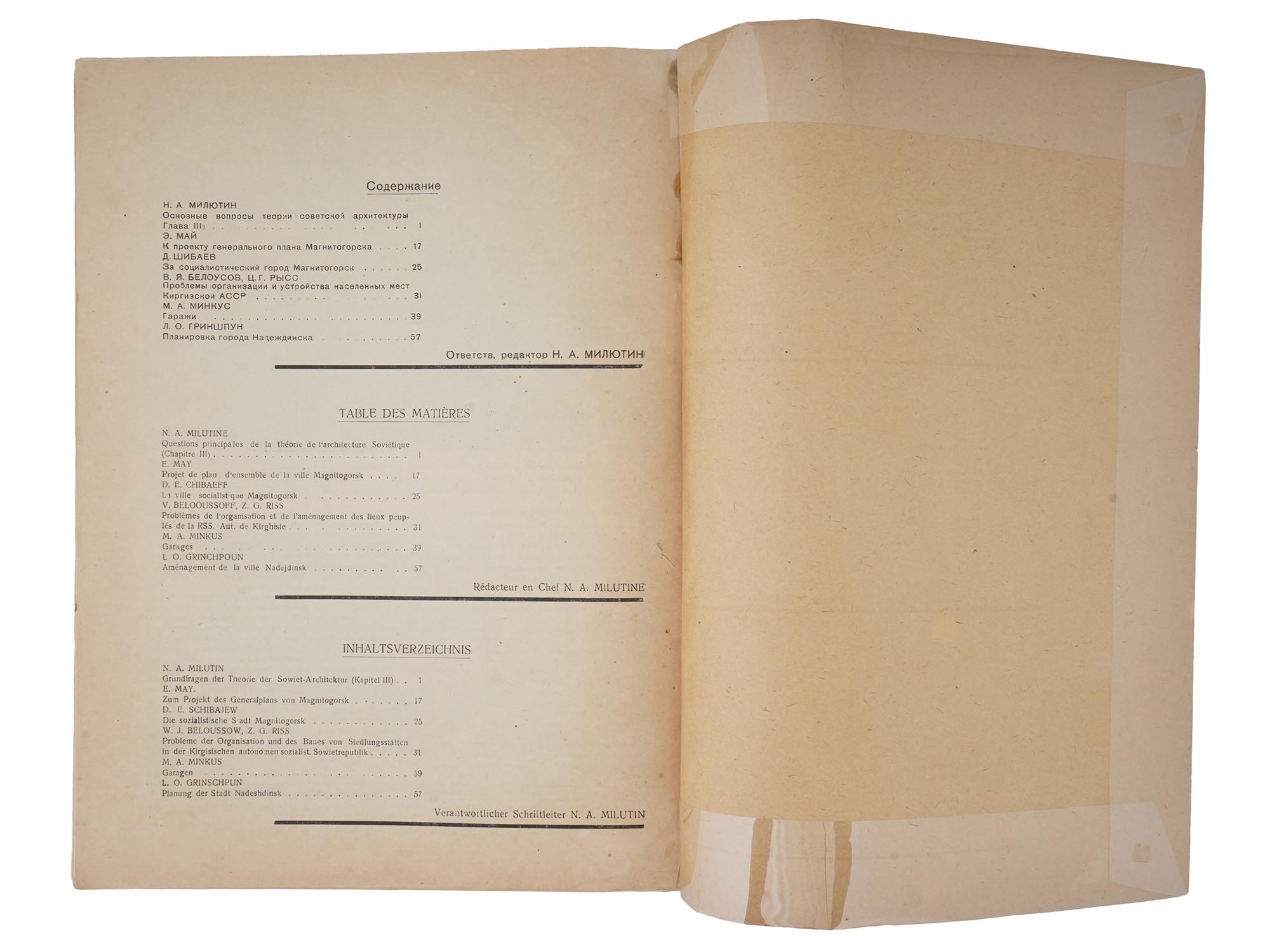 A Russian Soviet Era illustrated magazine issue number E Soviet Architecture, 1933. Completed with a printed reader questionnaire inside. The magazine Soviet Architecture is the organ of the Section of Social Settlement and Housing and Utility Construction of the Institute of Economics of the Communist Academy, the science sector of the Peoples Commissariat of Education and the Central Committee of the Union of Industrial and Housing and Utility Construction Workers. It was published with a frequency of 1 issue every 2 months by the State Scientific and Technical Publishing House from 1931 to 1934, a total of 15 issues of the magazine were published, including double issues. The magazine in its first issues, before the dissolution of creative groups, provided, perhaps, equal opportunities for the publication of their declarations, documents, articles and projects to innovative architectural groups. Executive editor N.A. Milyutin. Responsible Secretary K.S. Halabyan. Russian Soviet Era Librarian Illustrated Magazines, Books, Prints and Photos, and Collectibles.