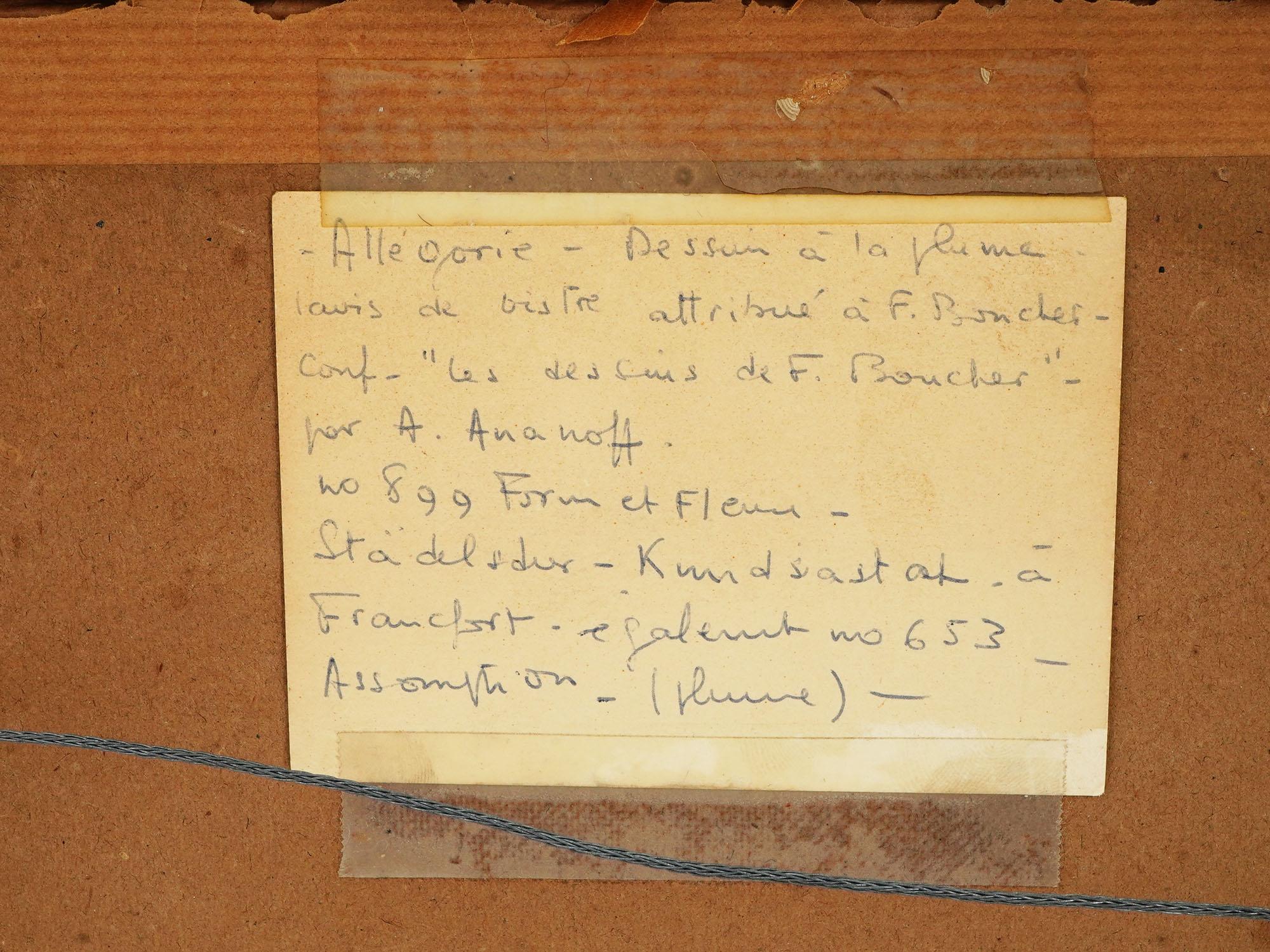 Ink on paper drawing, attributed to Francois Boucher, 1703 to 1770, a prominent French Rococo artist. The artwork is a sketch of a mythological scene, Athena Pallas surrounded by cherubs. Signed by the artist in the lower right. Titled Allegorie, Allegory on the backside. Information about the artwork in French is attached to the backside. Attribution sources: L Oeuvre Dessine de Francois Boucher by Alexandre Ananoff, collection of the Stadel Museum. Provenance: Parisian private estate. Blue mat, golden frame. Collectible European Graphic Art.